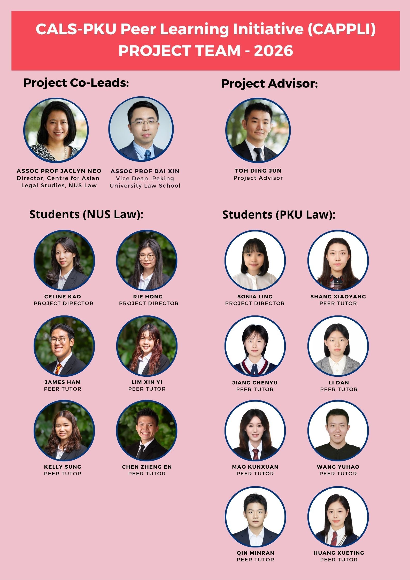 The Centre for Asian Legal Studies – Peking University School of Law Peer Learning Initiative, or CAPPLI, is a student-led project that was started in 2025 with the long-term goal of promoting direct knowledge exchange and academic collaboration between the law students at the National University of Singapore and Peking University.
