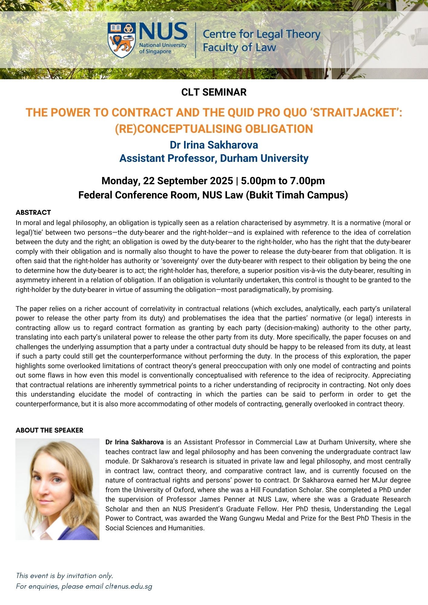 CLT Seminar: “The Power to Contract and the Quid Pro Quo ‘Straitjacket’: (Re)Conceptualising Obligation” by Dr Irina Sakharova, Durham University