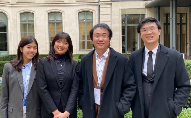 A team of NUS Law undergraduates comprising Mervyn Lin ’27, Tianao Li ’27, Taesha Tan ’27 and Joan Goh ’27 beat 47 other university teams from 32 countries to emerge victorious in the 20th International Chamber of Commerce (ICC) International Commercial Mediation Competition held in Paris on 8 February.