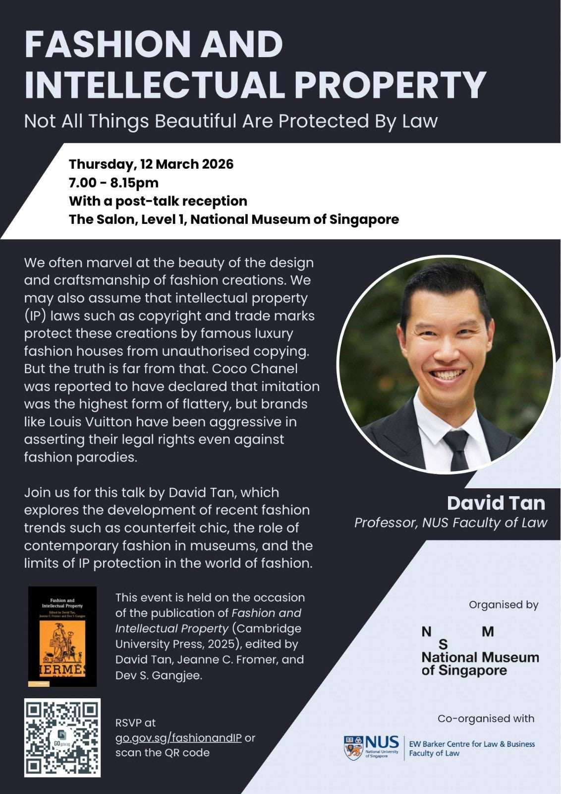 This talk by Prof David Tan explores the development of recent fashion trends such as counterfeit chic, the role of contemporary fashion in museums, and the limits of IP protection in the world of fashion.